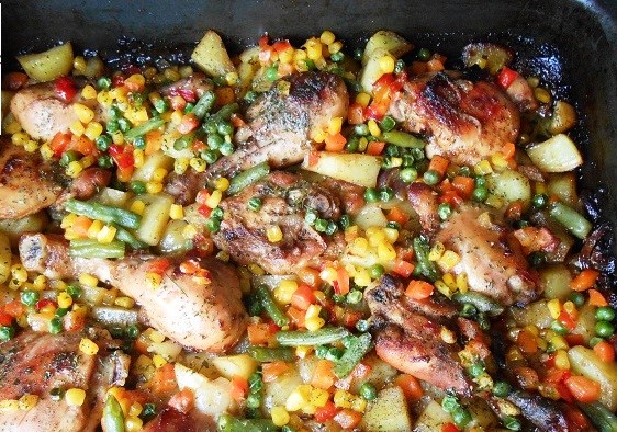 Pácolt csirkecombok burgonyával és zöldségkörettel